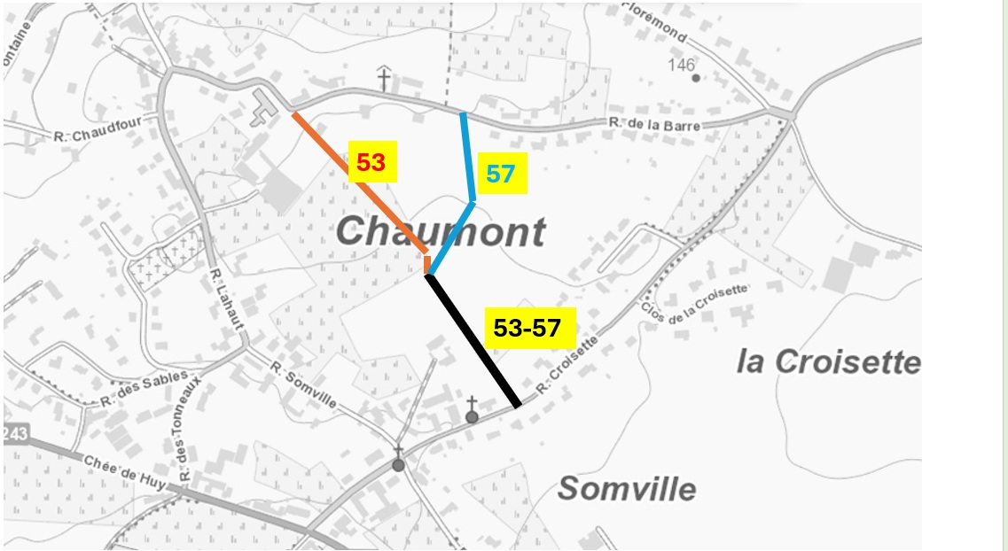 Comme vous pouvez le voir sur la carte ci-dessous, les sentiers 53 et 57 permettent de connecter la Rue de la Croisette à la rue de la Barre. Tout comme le sentier de l’école relie la Rue de Florémond à la rue de la Barre, où, effectivement, se trouve l’école de Chaumont.